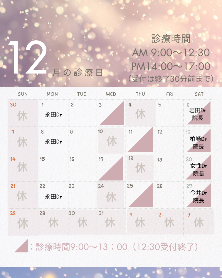 担当医の記載がない日はすべて院長の診察日です。12月もよろしくお願いいたします。※当院は院長、スタッフ、非常勤医師、すべて女性です。